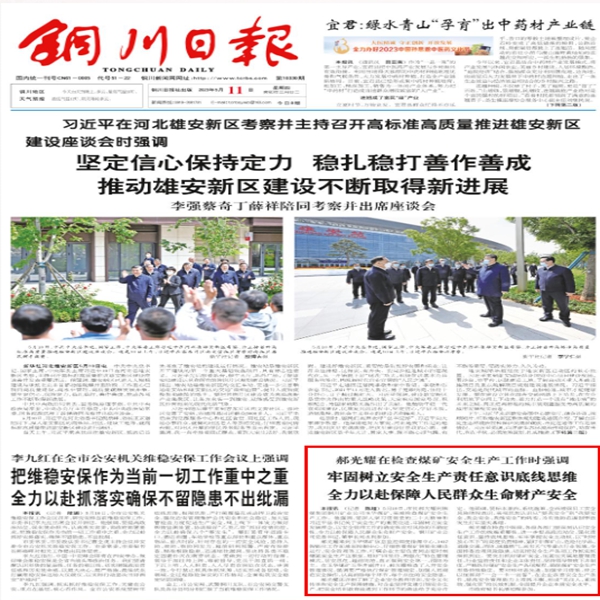 本報(bào)訊 (記者 陳超)5月10日,市長郝光耀到陜煤集團(tuán)銅川礦業(yè)公司玉華煤礦,實(shí)地檢查煤礦安全生產(chǎn)工作。他強(qiáng)調(diào),要深入學(xué)習(xí)貫徹黨的二十大精神和習(xí)近平總書記關(guān)于安全生產(chǎn)的重要論述,牢固樹立安全發(fā)展理念,以安全管理工作的確定性應(yīng)對(duì)風(fēng)險(xiǎn)的不確定性,全力以赴保障人民群眾生命財(cái)產(chǎn)安全。銅川礦業(yè)公司黨委書記、董事長劉水利參加。