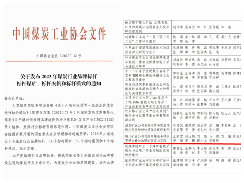 近日,中國(guó)煤炭工業(yè)協(xié)會(huì)發(fā)布“2023年煤炭行業(yè)標(biāo)桿煤礦、標(biāo)桿案例和標(biāo)桿模式名單”,《銅川礦業(yè)公司近距離煤層多種災(zāi)害耦合疊加治理的探索與實(shí)踐》項(xiàng)目成功上榜煤炭行業(yè)標(biāo)桿案例名單,為礦井高質(zhì)量發(fā)展注入科技動(dòng)能。