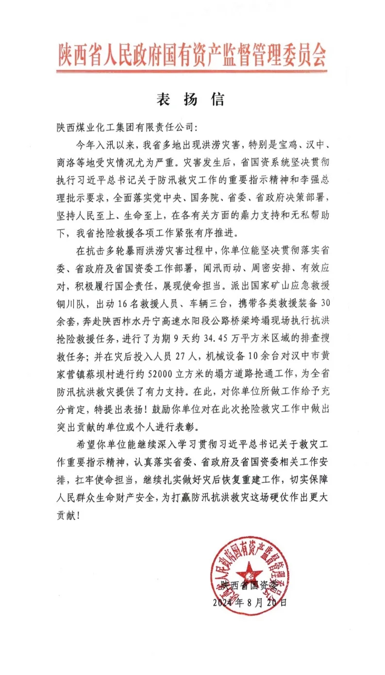 近日,陜西省國(guó)資委向陜煤集團(tuán)發(fā)來表揚(yáng)信,對(duì)集團(tuán)堅(jiān)決貫徹落實(shí)省委、省政府及省國(guó)資委工作部署,履行國(guó)企責(zé)任,展現(xiàn)使命擔(dān)當(dāng),派出集團(tuán)所屬的國(guó)家礦山應(yīng)急救援銅川隊(duì)(公司救護(hù)大隊(duì))全力馳援陜西柞水丹寧高速水陽段公路橋梁垮塌抗洪搶險(xiǎn)救援所做的工作給予了充分肯定和表揚(yáng)。