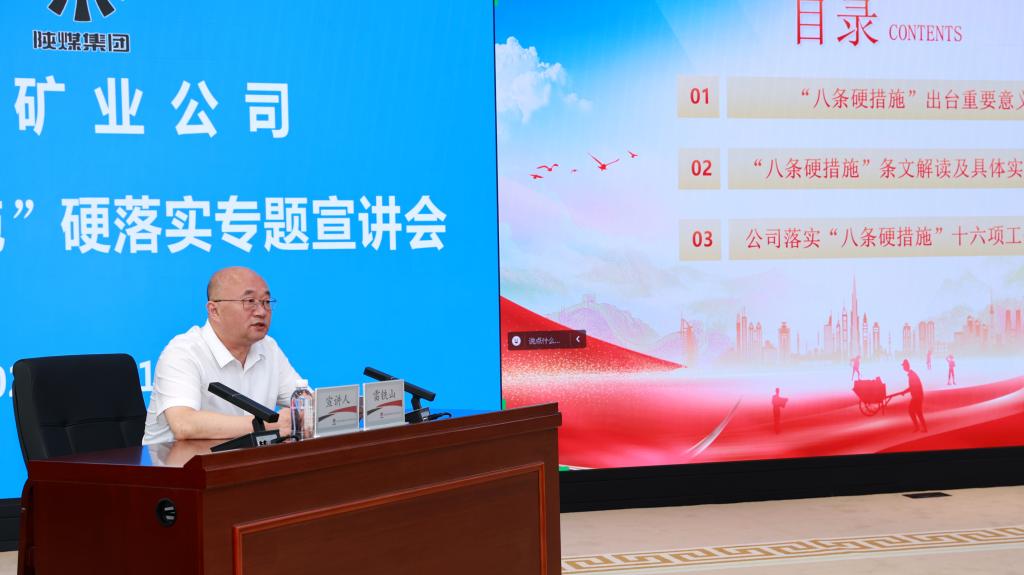 為認(rèn)真貫徹落實國家礦山安全監(jiān)察局關(guān)于“八條硬措施”硬落實相關(guān)要求,深刻把握“八條硬措施”精神實質(zhì)和科學(xué)內(nèi)涵,9月10日,公司在信息調(diào)度中心五樓會議室舉辦“八條硬措施”硬落實主題宣講會。公司黨委書記、董事長路根奎主持會議,公司黨委副書記、董事、總經(jīng)理雷鐵山作了宣講。