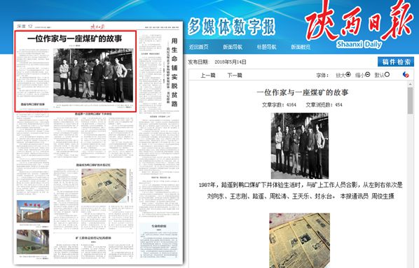 “那時我已調(diào)到銅川礦務(wù)局黨委機(jī)關(guān),銅川礦務(wù)局黨委宣傳部部長李廣年給我打電話,說路遙提起我,讓我一塊去鴨口煤礦。見面之后,路遙詢問了一下我當(dāng)時的工作情況。那天他又下井了?!敝芩蓾f。