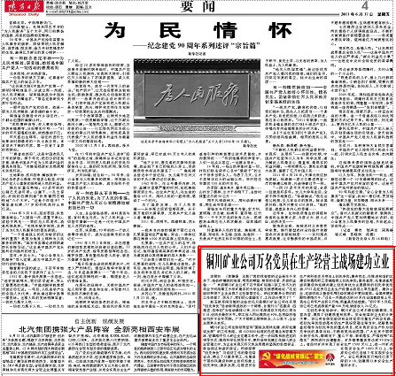 銅川礦業(yè)公司黨政領(lǐng)導(dǎo)堅(jiān)持“圍繞發(fā)展抓黨建,抓好黨建促發(fā)展”的工作思路,將ISO9000標(biāo)準(zhǔn)的先進(jìn)理念和管理方法、管理程序引入到企業(yè)黨建工作中,進(jìn)一步加強(qiáng)和改進(jìn)黨的領(lǐng)導(dǎo)方式,提高科學(xué)化領(lǐng)導(dǎo)水平,更好地將黨建工作融入到企業(yè)管理之中,為企業(yè)實(shí)現(xiàn)又好又快發(fā)展提供堅(jiān)強(qiáng)的思想保證、政治保證和組織保證。積極探索“創(chuàng)先爭(zhēng)優(yōu)”與經(jīng)濟(jì)工作的最佳結(jié)合點(diǎn),確立了以服務(wù)職工,在推進(jìn)干部作風(fēng)建設(shè)和樹立良好形象上創(chuàng)先爭(zhēng)優(yōu);服務(wù)發(fā)展,在推進(jìn)安全生產(chǎn)和科技攻關(guān)項(xiàng)目上創(chuàng)先爭(zhēng)優(yōu);服務(wù)民生,在推進(jìn)和諧礦區(qū)建設(shè)和提高職工幸福指數(shù)上創(chuàng)先爭(zhēng)優(yōu);服務(wù)基層,在推進(jìn)基層組織建設(shè)和黨群共建上創(chuàng)先爭(zhēng)優(yōu)為主要載體的創(chuàng)先爭(zhēng)優(yōu)活動(dòng),9753名黨員在企業(yè)生產(chǎn)經(jīng)營(yíng)主戰(zhàn)場(chǎng)上率先垂范,建功立業(yè),黨組織戰(zhàn)斗堡壘作用在經(jīng)濟(jì)建設(shè)中更加顯現(xiàn)。全國(guó)勞模徐殿民感慨萬(wàn)千:“過去一月掘進(jìn)達(dá)到60米在全國(guó)都能掛上號(hào),現(xiàn)在公司年產(chǎn)達(dá)到千萬(wàn)噸,簡(jiǎn)直是無(wú)法想象?!钡浇衲?月底,該公司已完成原煤產(chǎn)量508萬(wàn)噸,銷售收入24億元。