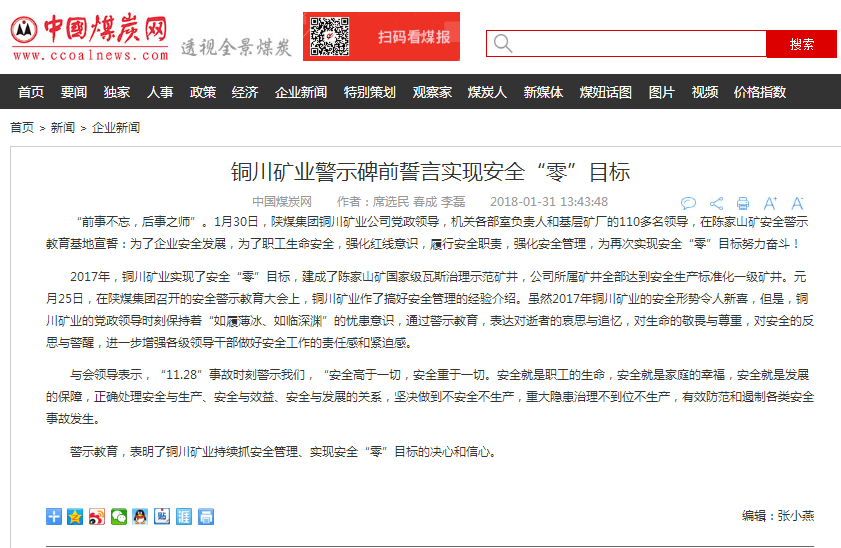警示教育,表明了銅川礦業(yè)持續(xù)抓安全管理、實(shí)現(xiàn)安全“零”目標(biāo)的決心和信心。