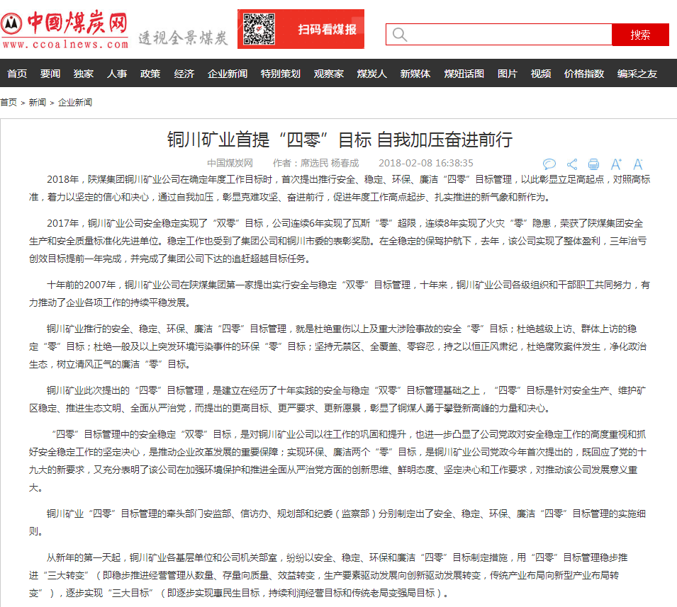 銅川礦業(yè)推行的安全、穩(wěn)定、環(huán)保、廉潔“四零”目標(biāo)管理,就是杜絕重傷以上及重大涉險(xiǎn)事故的安全“零”目標(biāo);杜絕越級(jí)上訪、群體上訪的穩(wěn)定“零”目標(biāo);杜絕一般及以上突發(fā)環(huán)境污染事件的環(huán)保“零”目標(biāo);堅(jiān)持無(wú)禁區(qū)、全覆蓋、零容忍,持之以恒正風(fēng)肅紀(jì),杜絕腐敗案件發(fā)生,凈化政治生態(tài),樹(shù)立清風(fēng)正氣的廉潔“零”目標(biāo)。