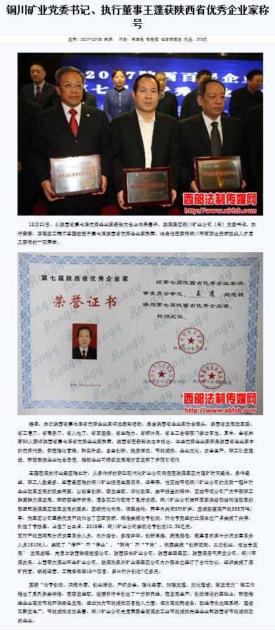 據(jù)悉,本次陜西省第七屆省優(yōu)秀企業(yè)家評(píng)選表彰活動(dòng),是由陜西省企業(yè)家協(xié)會(huì)牽頭,陜西省發(fā)展改革委、省工信廳、省商務(wù)廳、省人社廳、省國資委、省金融辦、省統(tǒng)計(jì)局、省總工會(huì)等部門參與審定。其中,全省共有50人獲評(píng)陜西省第七屆省優(yōu)秀企業(yè)家殊榮,陜西省在表彰決定中指出,這些優(yōu)秀企業(yè)家都是陜西省企業(yè)家中的優(yōu)秀代表,都在強(qiáng)化管理、轉(zhuǎn)型升級(jí)、自主創(chuàng)新、提質(zhì)增效、節(jié)能減排、企業(yè)文化、安全生產(chǎn)、職工隊(duì)伍建設(shè)、積極承擔(dān)企業(yè)社會(huì)責(zé)任、推動(dòng)企業(yè)可持續(xù)發(fā)展等方面發(fā)揮了示范引領(lǐng)作 王蓬在煤炭行業(yè)最困難之時(shí),從條件好的新型現(xiàn)代化礦業(yè)公司調(diào)任在陜煤集團(tuán)內(nèi)建礦時(shí)間最長(zhǎng)、條件最差、職工人數(shù)最多、經(jīng)營最困難的銅川礦業(yè)擔(dān)任主要領(lǐng)導(dǎo)。近年來,他團(tuán)結(jié)帶領(lǐng)銅川礦業(yè)公司的黨政一起針對(duì)企業(yè)改革發(fā)展的現(xiàn)實(shí)需要,以銳意創(chuàng)新、奮發(fā)進(jìn)取、深化改革、實(shí)干擔(dān)當(dāng)?shù)木?,團(tuán)結(jié)帶領(lǐng)公司廣大干部職工群策群力謀發(fā)展、砥礪奮進(jìn)開新局,使各項(xiàng)工作取得了良好成績(jī)。銅川礦業(yè)公司按照國家供給側(cè)結(jié)構(gòu)性改革的部署和陜煤集團(tuán)改革發(fā)展的要求,圍繞優(yōu)化布局、調(diào)整結(jié)構(gòu),兩年內(nèi)關(guān)閉5對(duì)礦井,壓減貧瘦煤產(chǎn)能555萬噸/年,為集團(tuán)公司置換優(yōu)質(zhì)產(chǎn)能作出了應(yīng)有貢獻(xiàn)。精準(zhǔn)實(shí)施治虧創(chuàng)效,對(duì)治虧無望的非煤?jiǎn)挝粡S點(diǎn)實(shí)施了關(guān)停,剎住了虧損車,止住了出血點(diǎn),2016年,銅川礦業(yè)公司實(shí)現(xiàn)治虧創(chuàng)效10.38億元。