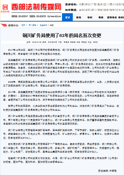 2017年12月28日,經(jīng)銅川市工商行政管理局核準(zhǔn),銅川礦務(wù)局的工商注冊名稱變更為陜煤集團(tuán)銅川礦務(wù)局有限公司,標(biāo)志著銅川礦務(wù)局公司制改革工作完成。