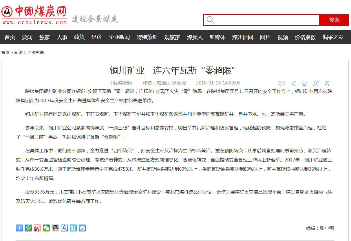 陜煤集團(tuán)銅川礦業(yè)公司連續(xù)6年實(shí)現(xiàn)了瓦斯“零”超限,連續(xù)8年實(shí)現(xiàn)了火災(zāi)“零”隱患,在陜煤集團(tuán)元月11日召開的安全工作會(huì)上,銅川礦業(yè)再次被陜煤集團(tuán)評(píng)為2017年度安全生產(chǎn)先進(jìn)集體和安全生產(chǎn)標(biāo)準(zhǔn)化先進(jìn)單位。