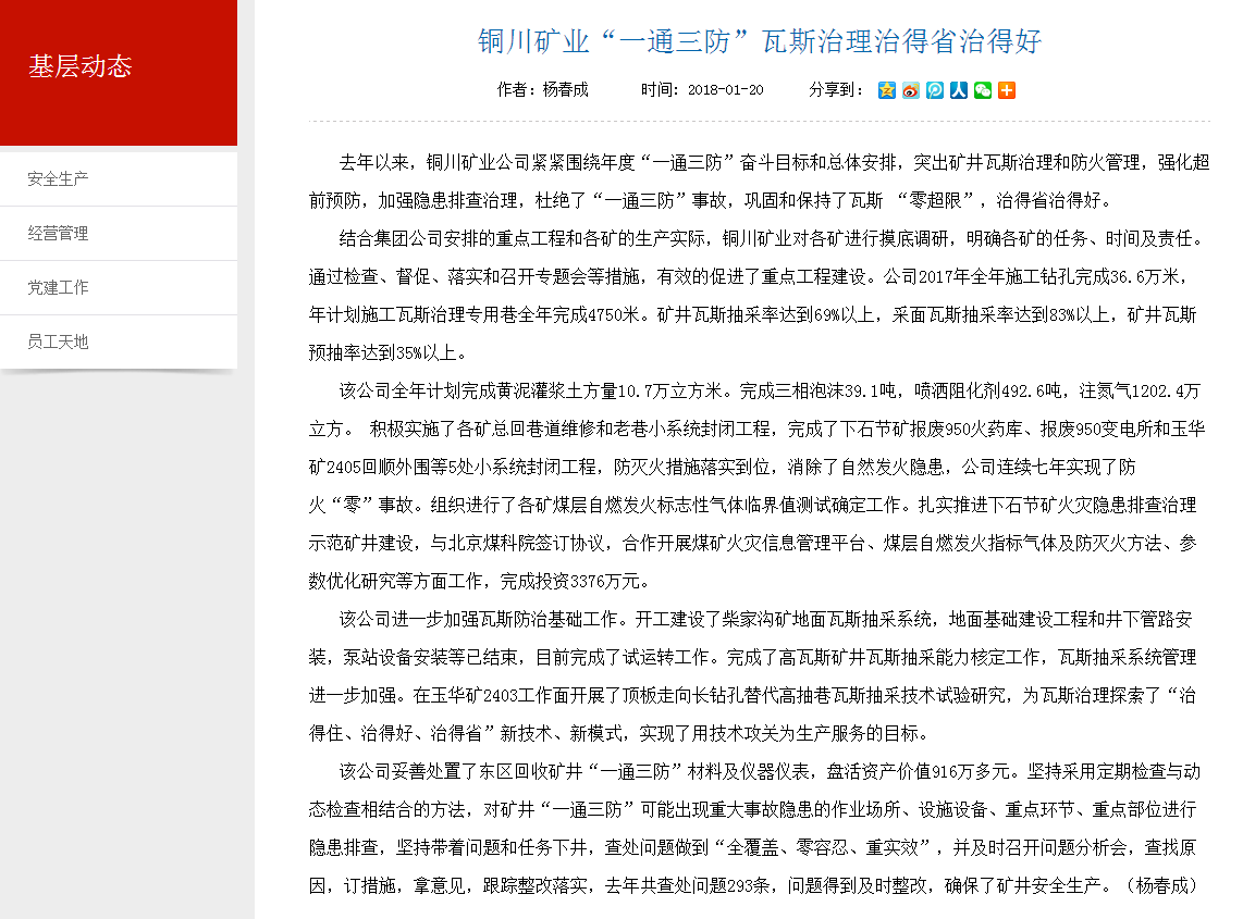 去年以來(lái),銅川礦業(yè)公司緊緊圍繞年度“一通三防”奮斗目標(biāo)和總體安排,突出礦井瓦斯治理和防火管理,強(qiáng)化超前預(yù)防,加強(qiáng)隱患排查治理,杜絕了“一通三防”事故,鞏固和保持了瓦斯 “零超限”,治得省治得好。