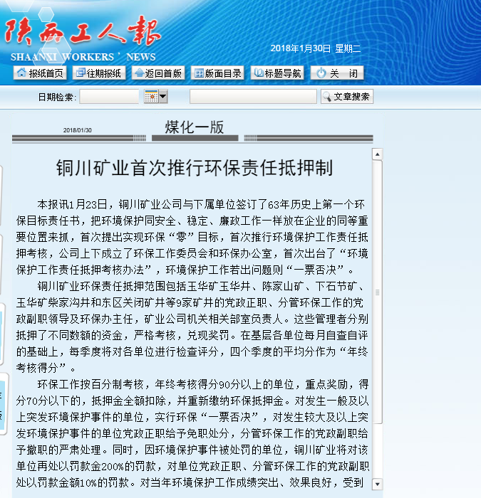 本報(bào)訊1月23日,銅川礦業(yè)公司與下屬單位簽訂了63年歷史上第一個(gè)環(huán)保目標(biāo)責(zé)任書,把環(huán)境保護(hù)同安全、穩(wěn)定、廉政工作一樣放在企業(yè)的同等重要位置來(lái)抓,首次提出實(shí)現(xiàn)環(huán)?!傲恪蹦繕?biāo),首次推行環(huán)境保護(hù)工作責(zé)任抵押考核,公司上下成立了環(huán)保工作委員會(huì)和環(huán)保辦公室,首次出臺(tái)了“環(huán)境保護(hù)工作責(zé)任抵押考核辦法”,環(huán)境保護(hù)工作若出問(wèn)題則“一票否決”。