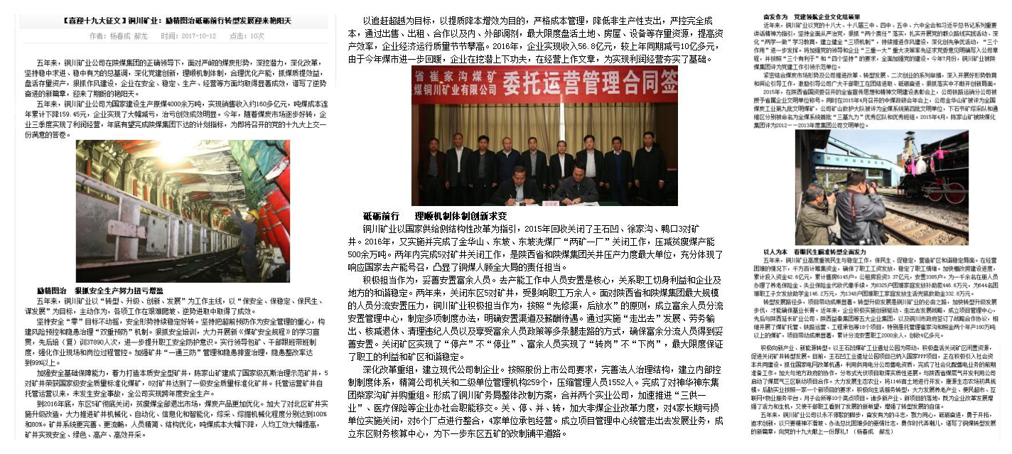 五年來(lái),銅川礦業(yè)公司以永不停歇的腳步,奮發(fā)有為的斗志,戮力同心,砥礪奮進(jìn),勇于開(kāi)拓,追求創(chuàng)新,以只要精神不滑坡、辦法總比困難多的豪情壯志,勇作時(shí)代弄潮兒,譜寫了銅煤轉(zhuǎn)型發(fā)展的新篇章,向黨的十九大獻(xiàn)上一份厚禮!