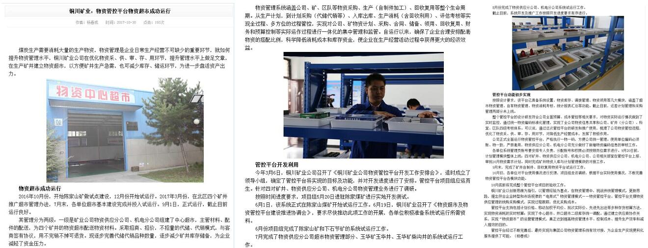 2016年10月份,開(kāi)始陳家山礦做試點(diǎn)建設(shè),12月份開(kāi)始試運(yùn)行。2017年3月份,在北區(qū)四個(gè)礦井推廣超市管理辦法,7月末,各單位超市基本建設(shè)完成并投入試運(yùn)行。9月1日,正式運(yùn)行,截止目前運(yùn)行良好。