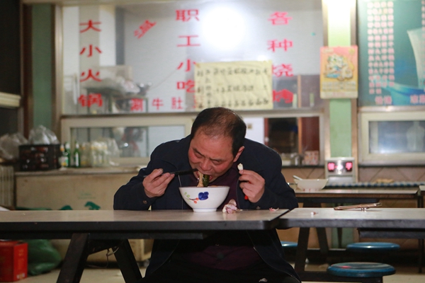 洗完澡來(lái)到食堂,李保舉要了碗油潑面,狼吞虎咽地吃了起來(lái)。他說(shuō)這是他一天最開(kāi)心的時(shí)刻。從早上7點(diǎn)到現(xiàn)在已經(jīng)15個(gè)小時(shí)了。(圖⑦)