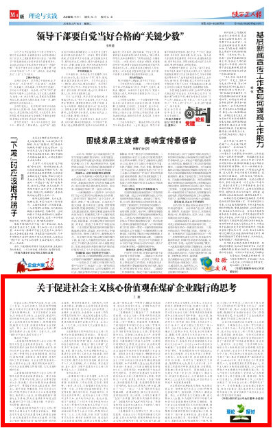 一是要推動培育和踐行社會主義核心價值觀與促進(jìn)企業(yè)發(fā)展緊密融合。要進(jìn)一步明晰國有煤礦企業(yè)肩負(fù)的重要政治責(zé)任、經(jīng)濟(jì)責(zé)任和社會責(zé)任,切實(shí)將培育和踐行社會主義核心價值觀與企業(yè)的改革發(fā)展、經(jīng)濟(jì)運(yùn)行、結(jié)構(gòu)調(diào)整、創(chuàng)新驅(qū)動、提質(zhì)增效、轉(zhuǎn)型升級等工作緊密融合,與企業(yè)的價值追求相一致,與服務(wù)社會發(fā)展,履行職責(zé)使命相照應(yīng),從而為企業(yè)發(fā)展確立價值引領(lǐng)、文化支撐和精神動力。