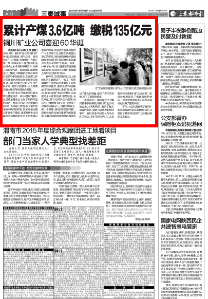 60年來,在黨和政府以及上級組織的正確領導下,一代又一代的銅煤礦工肩負起全省煤炭工業(yè)發(fā)展的歷史重任,繼承發(fā)揚“特別能戰(zhàn)斗”的光榮傳統(tǒng),秉承“團結、務實、創(chuàng)新、高效”的企業(yè)精神,以高度的主人翁責任感,艱苦創(chuàng)業(yè)、無私奉獻,累計為國家生產(chǎn)原煤3.6億噸,上繳稅費135億元,企業(yè)資產(chǎn)總額達到146億元,用勤勞的雙手,把一個簡陋、落后的舊同官煤礦,建設成為西北地區(qū)重要的能源基地,為陜西省和國家的經(jīng)濟建設作出了重大的貢獻,建立了不朽的功勛,寫下了輝煌的篇章。
