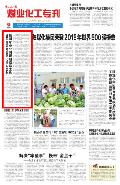 7月21日,陜西省國資委黨委書記孫安會(huì)來到陜煤化集團(tuán)銅川礦業(yè)公司就企業(yè)安全生產(chǎn)、經(jīng)營管理、改革發(fā)展等工作進(jìn)行調(diào)研指導(dǎo)。省國資委副巡視員杜芳軍,陜煤化集團(tuán)總經(jīng)理嚴(yán)廣勞及銅川礦業(yè)公司領(lǐng)導(dǎo)陪同調(diào)研。