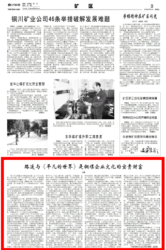 對(duì)于銅川特別是銅川礦業(yè)公司(銅川礦務(wù)局),路遙掛職創(chuàng)作的過程,以及誕生于斯的《平凡的世界》,都是不可多得的極其寶貴的文化遺產(chǎn),它對(duì)企業(yè)文化建設(shè)具有特殊重要的意義。在路遙的積極影響下,我們的企業(yè)文化建設(shè)目標(biāo)遠(yuǎn)大而堅(jiān)定,我們的職工文藝創(chuàng)作呈現(xiàn)持續(xù)繁榮,一大批文學(xué)創(chuàng)作人才和優(yōu)秀作品脫穎而出,涌現(xiàn)出了《礦長(zhǎng)的上午》、《昨夜簫聲》等一批具有全省乃至全國(guó)影響的優(yōu)秀文學(xué)作品,各類中省市文學(xué)獎(jiǎng)項(xiàng)層出不窮,涌現(xiàn)出了中國(guó)作家協(xié)會(huì)會(huì)員、銅川市作協(xié)主席黃衛(wèi)平,陜西省德藝雙馨優(yōu)秀作家、陜西煤化作協(xié)副主席楊治華,小說作家楊生武、輪椅詩人王鐵毛、煤炭詩人李祥云和李建榮,以及散文作家蘭阿利、曲藝作家黎樹文等一批文藝創(chuàng)作的骨干人物。這里,還產(chǎn)生了譽(yù)滿三秦、聲震全國(guó)的礦務(wù)局職工軍樂團(tuán),以及“銅煤歌會(huì)”這樣的著名文化品牌。另外,我們大力倡導(dǎo)職工通過讀書學(xué)習(xí)提高科學(xué)文化素質(zhì)和生產(chǎn)技能,造就了一支素質(zhì)優(yōu)良、作風(fēng)過硬的職工隊(duì)伍。公司黨政提出要求:廣大干部每月讀一本好書,寫兩篇結(jié)合工作實(shí)際的理論文章,以提高文化素質(zhì)和思想政治水平,提高干事創(chuàng)業(yè)、克難攻堅(jiān)的過硬本領(lǐng),提高愛崗敬業(yè)、忠于職守的職業(yè)操守,提高凝心聚力、不畏困難的堅(jiān)強(qiáng)意志。百里礦區(qū),讀書學(xué)習(xí)蔚然成風(fēng),精神面貌煥然一新,工作成效明顯提高。在努力實(shí)施加快企業(yè)轉(zhuǎn)型發(fā)展、二次創(chuàng)業(yè)的進(jìn)程中,干部職工識(shí)大體,顧大局,明大義,精誠(chéng)團(tuán)結(jié),努力作為,向著戰(zhàn)勝困難度嚴(yán)冬,建設(shè)強(qiáng)局再輝煌的目標(biāo)昂然奮進(jìn)!