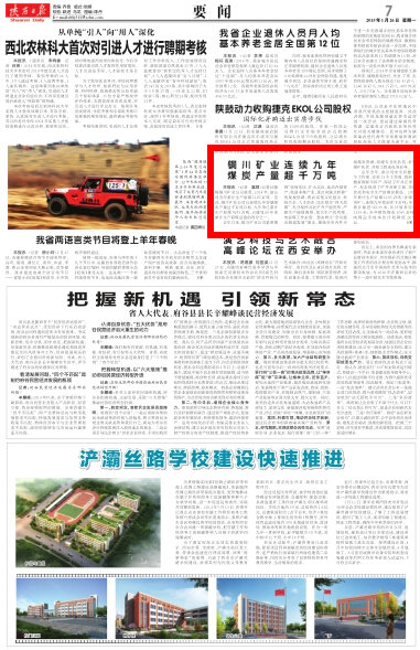 去年以來,銅川礦業(yè)公司緊密圍繞“收縮東區(qū),擴大北區(qū),盤活存量資產(chǎn),做強非煤產(chǎn)業(yè),重點向陜北轉(zhuǎn)移”的發(fā)展思路,著力實施文化強企、科技興企、人才助企、民生穩(wěn)企“四大戰(zhàn)略”,充分發(fā)揮北區(qū)礦井產(chǎn)能優(yōu)勢,嚴抓生產(chǎn)接續(xù)調(diào)整,加大生產(chǎn)優(yōu)質(zhì)煤、效益煤工作力度。努力樹立“全員找出路謀發(fā)展”理念,繼續(xù)在省內(nèi)外尋找煤炭資源,組建專業(yè)化隊伍,開展煤礦托管、井巷工程承包等業(yè)務。