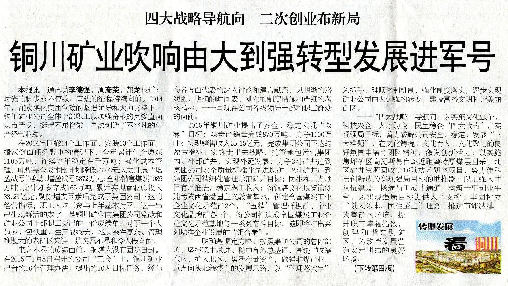 ★1月18日“銅川日報”頭版頭條刊發(fā)《銅川礦業(yè)吹響由大到強轉型發(fā)展進軍號》(作者:李德強 周彥榮 郝龍)