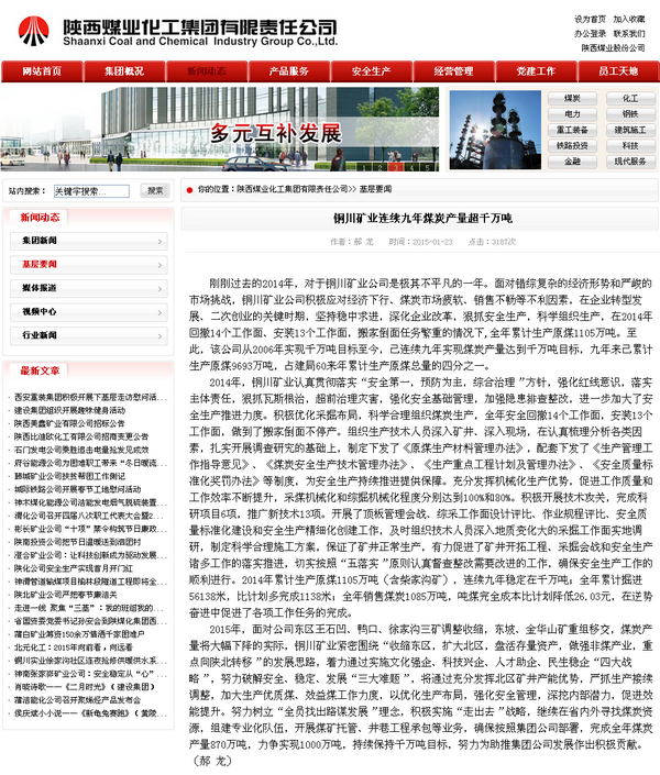 ★ 1月23日“陜煤化集團網站”刊發(fā)《銅川礦業(yè)連續(xù)九年煤炭產量超千萬噸》(作者:郝龍)