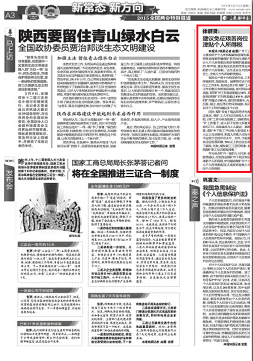 作為來自礦井一線的人大代表,徐群賢建議,盡快免征煤礦井下艱苦崗位津貼個人所得稅,研究提高煤礦井下工人個人所得稅起征點或按家庭收入計征個人所得稅。