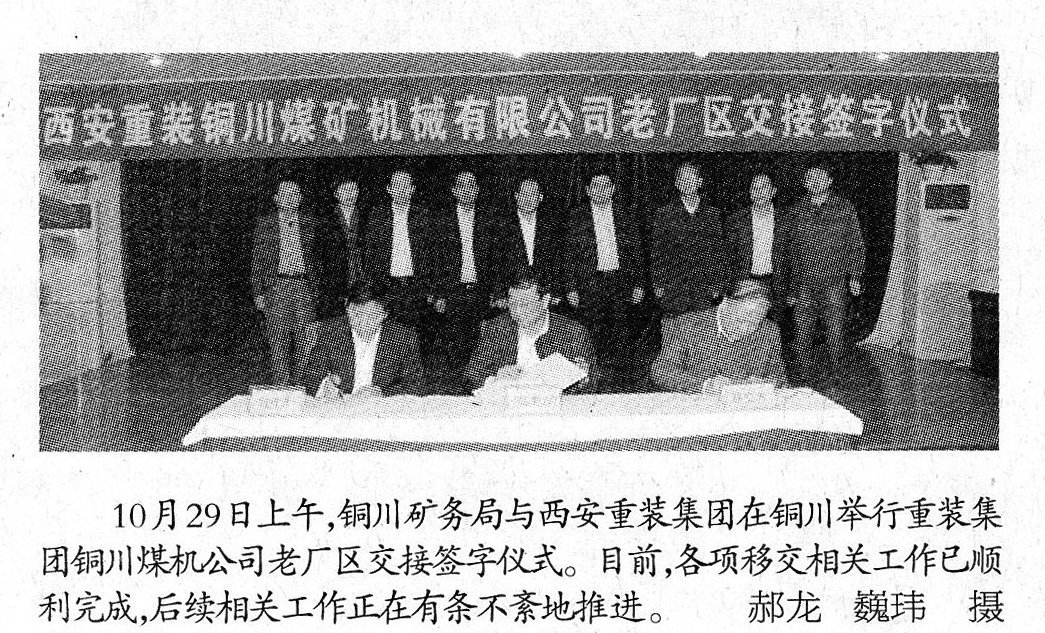 ● 11月4日“陜西工人報”刊發(fā)《銅川礦務(wù)局與西安重裝集團(tuán)在銅川舉行重裝集團(tuán)銅川煤機(jī)公司老廠區(qū)交接簽字儀式》
