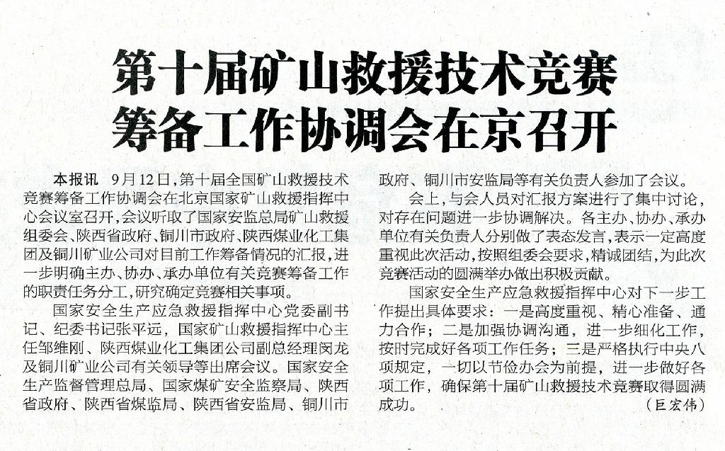 ★9月23日“陜西工人報”刊發(fā)《第十屆礦山救援技術(shù)競賽籌備工作協(xié)調(diào)會在京召開》(作者:巨宏偉)