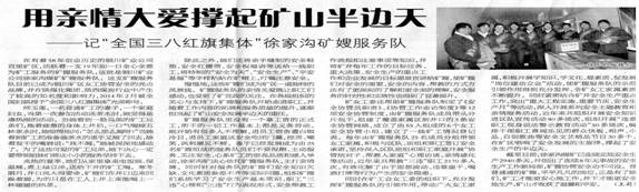 ● 4月1日“陜西工人報”三版刊發(fā)《用親情大愛撐起礦山半邊天--記“全國三八紅旗集體”徐家溝礦嫂服務隊》(作者:王莉)