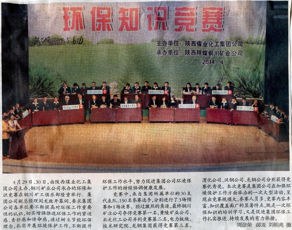 ★ 5月6日“陜西工人報(bào)”刊發(fā)《陜煤化集團(tuán)環(huán)保知識(shí)競(jìng)賽在銅川礦業(yè)公司舉行》(作者:周彥榮 郝龍 劉朝亮)
