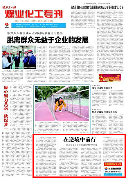 陜西工人報 2013年10月1日 頭版 從去年開始,一場突如其來而又持久不退的煤市“寒冬”,使全國煤炭市場出現(xiàn)重大逆轉(zhuǎn)。面對“寒冬”,是苦練內(nèi)功、化危為機,還是等靠要熬、被動應(yīng)對?銅川礦業(yè)公司黨政給出的答案是:依靠管理創(chuàng)新、深挖內(nèi)部潛力,努力在砥礪進取中趟出一條逆勢奮進的新路子。全員參戰(zhàn)抓好煤質(zhì)這個命根子