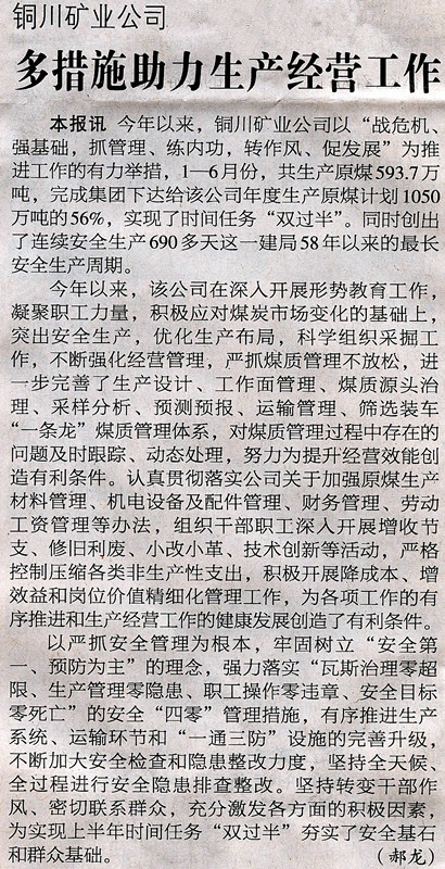 ★ 8月27日“陜西工人報(bào)”刊發(fā)《銅川礦業(yè)公司多措施助力生產(chǎn)經(jīng)營(yíng)工作》(作者:郝龍)