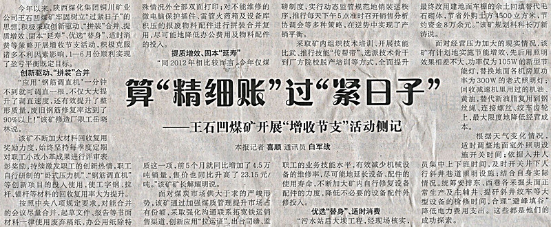 ★ 8月19日“陜西日?qǐng)?bào)”刊發(fā)《算“精細(xì)帳”過“緊日子”——王石凹煤礦開展增收節(jié)支活動(dòng)側(cè)記》(作者:喜順 白軍戰(zhàn))