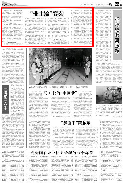 陜西工人報(bào) 2013年7月9日 煤業(yè)三版 “老馮這是咋了,整天喜笑顏開(kāi)的,好像中大獎(jiǎng)了?”“人家踏實(shí)能干,媳婦也賢惠,可不就幸福著哩!”最近,銅川礦業(yè)東坡煤礦掘五隊(duì)職工馮建倉(cāng)的幸福,感染了工友,令大家熱烈地議論起來(lái),聚焦到了“把親情帶下井、把安全帶回家”主題活動(dòng)。這一活動(dòng),催生了老馮一家的“非主流”變奏。