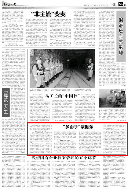 陜西工人報(bào) 2013年7月9日 煤業(yè)三版 提到柴振東,大家就會(huì)想到他的安全管理三法:“婆婆嘴”、“飛毛腿”、“鐵手腕”。作為銅川鴨口公司綜采一隊(duì)檢修班班長(zhǎng),他以獨(dú)有的方式履行著崗位職責(zé)。安全管理的“婆婆嘴”
