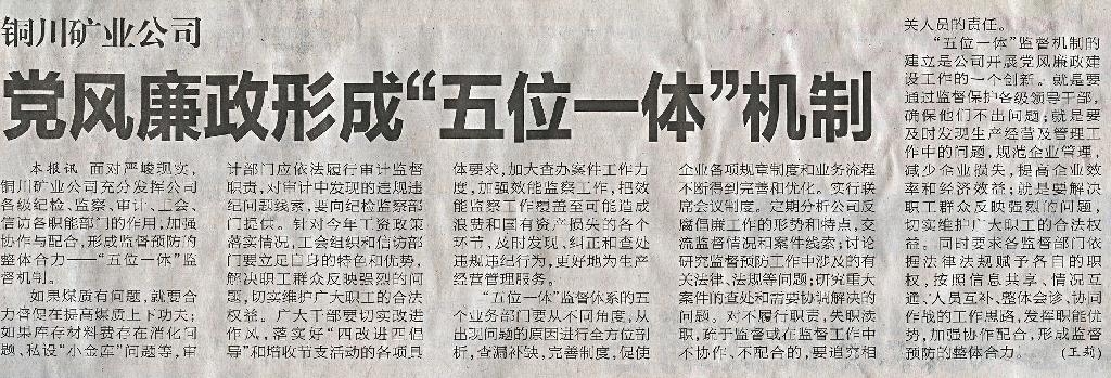 ● 4月16日“陜西工人報(bào)”煤業(yè)二版刊發(fā)《銅川礦業(yè)公司黨風(fēng)廉政形成“五位一體”機(jī)制》(作者:王莉)