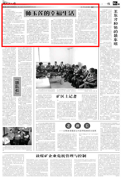 師玉蓮現(xiàn)在覺得特知足,特滿足,覺得自己的生活真是太幸福了。她真誠地對筆者說:“俺不在乎有錢沒錢,不在乎吃的好壞,不在乎穿金戴銀,開心就好。而最讓俺開心的就是作為礦嫂能為礦工兄弟做點事情,能帶領(lǐng)姐妹們贏得贊賞和尊重,實現(xiàn)我們平凡的人生價值。哈哈,給你說吧,俺現(xiàn)在最幸福的就是站在領(lǐng)獎臺上,接受領(lǐng)導(dǎo)給俺們頒獎,俺覺得自己是最有用的礦山女人了?!保ㄍ趵颍?/p>
