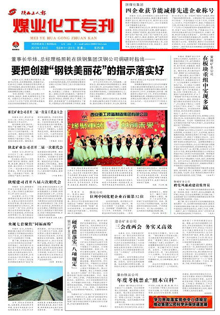 陜西工人報 2013年元月8日 頭版 近日,從中國煤炭工業(yè)協(xié)會和中國煤炭加工利用協(xié)會傳來喜訊,陜煤化集團所屬的黃陵礦業(yè)公司、銅川礦業(yè)公司、澄合礦業(yè)公司及陜西中能煤田公司被評為2010-2011年度煤炭工業(yè)節(jié)能減排先進企業(yè)。陜煤化集團自成立以來,緊密結(jié)合國家的產(chǎn)業(yè)政策,堅持以科技創(chuàng)新為支撐,遵循“減量化、再利用、再循環(huán)”的原則,通過老礦區(qū)技術(shù)改造、新礦區(qū)的產(chǎn)能升級,實現(xiàn)了高產(chǎn)高效開采;加大礦井廢水、煤矸石、煤泥、粉煤灰、煤氣層的利用力度,引導下屬企業(yè)由依靠煤炭產(chǎn)量的增長轉(zhuǎn)到提高煤炭綜合開發(fā)利用的質(zhì)量和效益上來,實現(xiàn)了煤與煤伴生資源的綜合開發(fā)、深度加工、清潔利用,發(fā)展生態(tài)煤炭工業(yè)。
