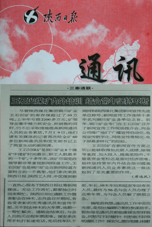 盡管陜西煤化集團(tuán)銅川礦業(yè)公司王石凹礦的庫(kù)存煤超過了10萬(wàn)噸,上半年虧損2200多萬(wàn)元,礦領(lǐng)導(dǎo)在集中精力抓安全、抓銷售的同時(shí),仍不忘采取措施提高新聞通訊人員的業(yè)務(wù)素質(zhì),7月19日,他們請(qǐng)有關(guān)媒體的記者再次給全礦60多位新聞通訊員和黨支部書記上了兩堂生動(dòng)的新聞?wù)n。