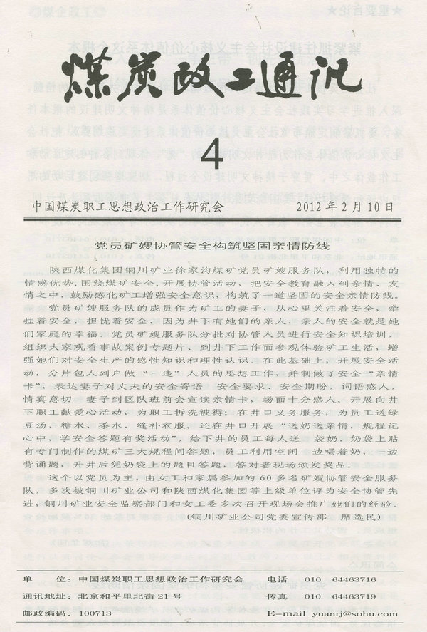 陜西煤化集團銅川礦業(yè)徐家溝煤礦有限責任公司黨員礦嫂服務隊,利用獨特的情感優(yōu)勢,圍繞煤礦安全,開展協(xié)管活動,把安全教育融入到親情、友情之中,鼓勵感化礦工增強安全意識,構(gòu)筑了一道堅固的安全親情防線。