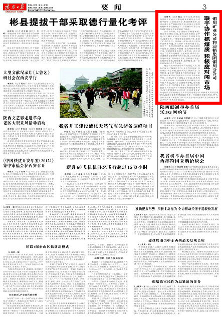 本報訊 (記者 高 山)今年以來,陜煤化集團銅川礦業(yè)公司和運銷集團銅川分公司聯(lián)手協(xié)作,以質(zhì)量求生存,用信譽保市場,共同應(yīng)對日益嚴峻的市場形勢,在兩公司高度重視和各單位的努力下,目前銅川礦業(yè)公司所屬礦井煤炭質(zhì)量較前有了提高。