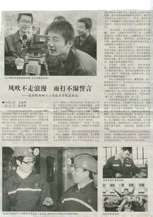 近日,記者走進(jìn)這個(gè)“90后”學(xué)生所在的學(xué)校——陜西銅川工業(yè)技術(shù)學(xué)院,近距離采訪在校生的學(xué)習(xí)、生活情況。這所學(xué)校的前身是銅川煤礦技工學(xué)校,學(xué)校位于煤城銅川鬧市區(qū),走過(guò)一條靜謐小巷,邁入學(xué)校大門,寬敞明亮的教室和粉刷一新的實(shí)驗(yàn)基地掩映在綠樹(shù)叢中,很難讓人相信這里是一所煤礦技工學(xué)校,它完全可以和正規(guī)大專院校相媲美。記者驚訝于這所院校優(yōu)雅干凈的環(huán)境及完備的教學(xué)設(shè)施,更驚訝于活躍在校園各個(gè)角落,充滿朝氣和活力的年輕身影,陽(yáng)光灑在他們身上,泛著淡淡金光,這是一批甘愿為煤礦井下事業(yè)奉獻(xiàn)青春和智慧的新時(shí)代“90后”技校生。