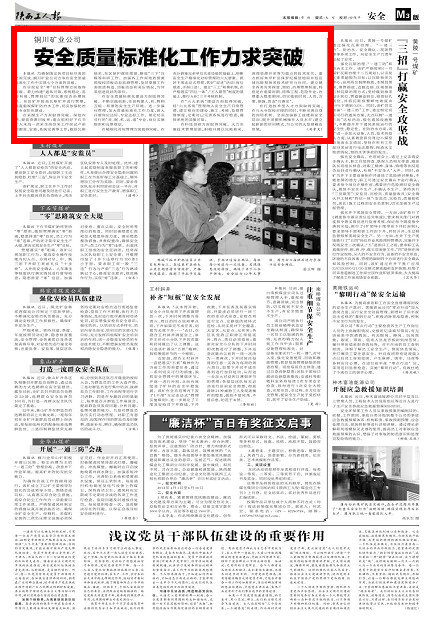 本報(bào)訊(劉孝文)為確保既定各項(xiàng)目標(biāo)任務(wù)的全面完成,銅川礦業(yè)公司力爭(zhēng)在安全質(zhì)量標(biāo)準(zhǔn)化工作中實(shí)現(xiàn)七個(gè)方面的突破。