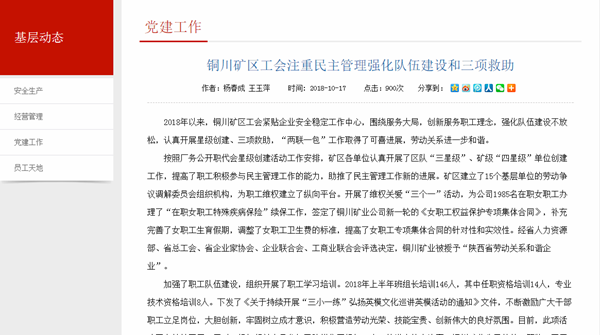 2018年以來,銅川礦區(qū)工會緊貼企業(yè)安全穩(wěn)定工作中心,圍繞服務(wù)大局,創(chuàng)新服務(wù)職工理念,強(qiáng)化隊伍建設(shè)不放松,認(rèn)真開展星級創(chuàng)建、三項救助,“兩聯(lián)一包”工作取得了可喜進(jìn)展,勞動關(guān)系進(jìn)一步和諧。