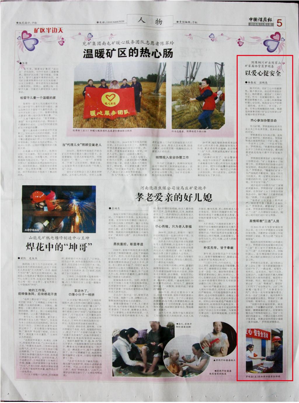 羅明喜經(jīng)常參加礦上組織的女工協(xié)管活動(dòng)。“礦上很重視女工協(xié)管工作,經(jīng)常組織我們女工協(xié)管員進(jìn)行安全培訓(xùn),再由我們?nèi)鬟f安全理念?!绷_明喜說,“隨著我們礦井下生產(chǎn)戰(zhàn)線的不斷延伸,安全工作壓力比較大,我一定要充分發(fā)揮女工協(xié)管員的作用,讓礦工高高興興上班,平平安安下班。”