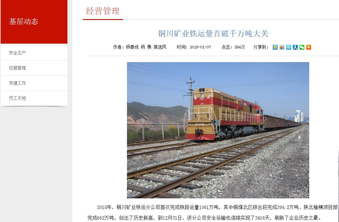 2018年,銅川礦業(yè)鐵運分公司首次完成鐵路運量1061萬噸,其中銅煤北區(qū)綜合段完成399.2萬噸、陜北榆橫項目部完成662萬噸,創(chuàng)出了歷史新高,到12月31日,該分公司安全運輸也連續(xù)實現(xiàn)了3416天,刷新了企業(yè)歷史之最。