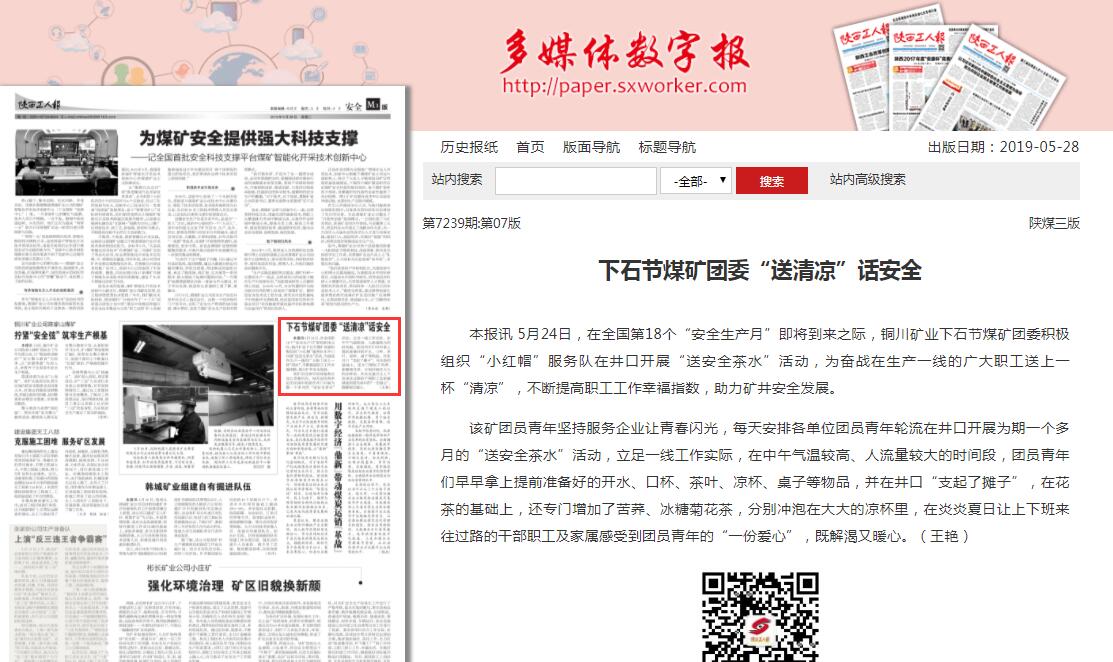本報訊 5月24日,在全國第18個“安全生產(chǎn)月”即將到來之際,銅川礦業(yè)下石節(jié)煤礦團(tuán)委積極組織“小紅帽”服務(wù)隊在井口開展“送安全茶水”活動,為奮戰(zhàn)在生產(chǎn)一線的廣大職工送上一杯“清涼”,不斷提高職工工作幸福指數(shù),助力礦井安全發(fā)展。