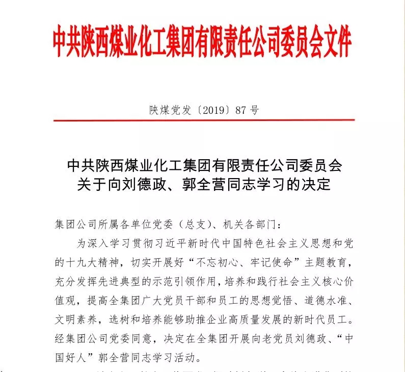 近日,陜煤集團黨委印發(fā)文件,在全集團范圍內(nèi)開展向老黨員劉德政、“中國好人”郭全營同志學習活動。文件指出,劉德政同志一輩子初心不改、本色不變,是共產(chǎn)黨員的楷模。學習劉德政同志,就是要學習他淡泊名利、矢志奉獻的精神,學習他堅守初心、不忘本色的高尚情操。郭全營同志一直以來急公好義、樂于助人,是陜煤員工的榜樣。學習郭全營同志,就是要學習他無私奉獻、向上向善的好人精神,學習他見義勇為、扶危濟困的最美品德。