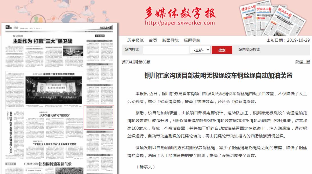 本報訊 近日,銅川礦務(wù)局崔家溝項目部發(fā)明無極繩絞車鋼絲繩自動加油裝置,不僅降低了人工勞動強度,減少了鋼絲繩磨損,提高了抹油效率,還延長了鋼絲繩壽命。
