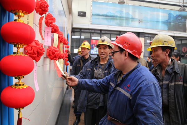 “老袁,快來看這個(gè),幫幫我,答對(duì)了獎(jiǎng)品算你一半,正好也跟你學(xué)習(xí)學(xué)習(xí)?!薄白屛蚁胂氚?,嗯,嗯……不按曲譜彈琴,應(yīng)該是違章操作吧?”綜掘二隊(duì)楊先方雙手拉著工友袁復(fù)軍的胳膊,兩人如同小孩子一般,開工前也樂呵呵了起來,大紅的燈籠懸掛人群的兩側(cè),歡聲笑語讓錚錚鐵骨露出柔情的一面。