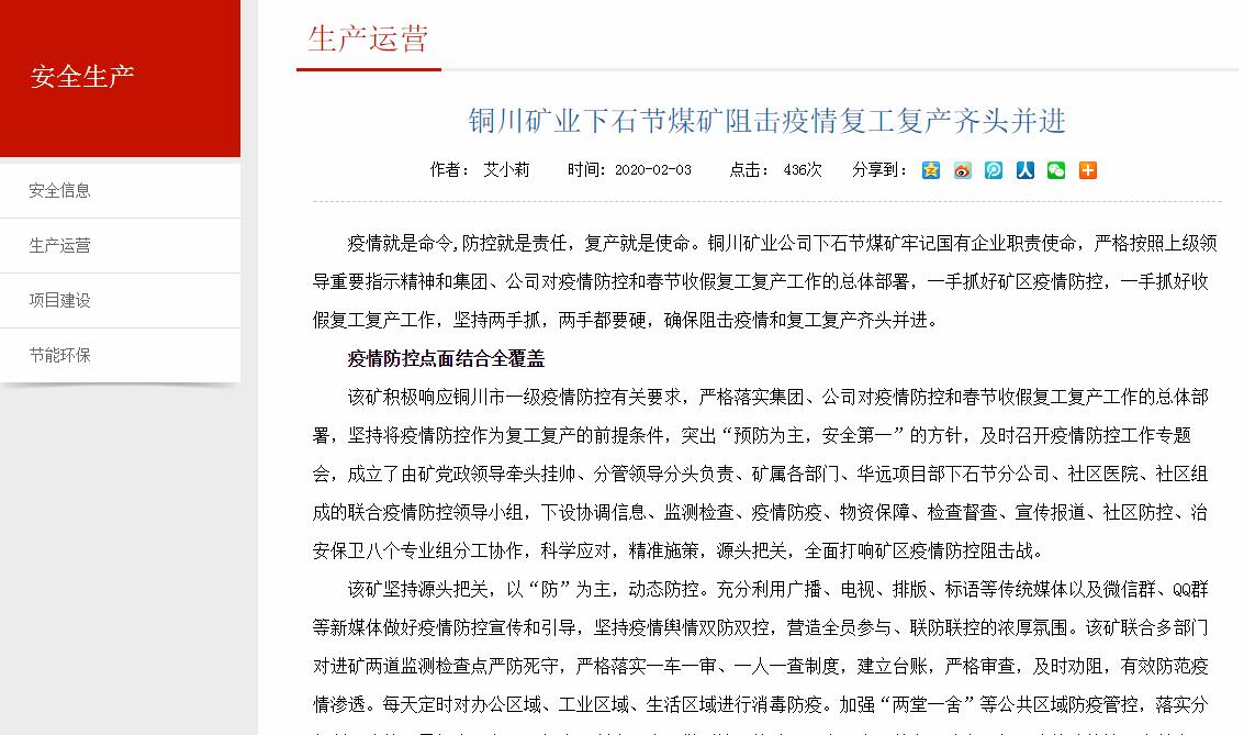 疫情就是命令,防控就是責(zé)任,復(fù)產(chǎn)就是使命。銅川礦業(yè)公司下石節(jié)煤礦牢記國(guó)有企業(yè)職責(zé)使命,嚴(yán)格按照上級(jí)領(lǐng)導(dǎo)重要指示精神和集團(tuán)、公司對(duì)疫情防控和春節(jié)收假復(fù)工復(fù)產(chǎn)工作的總體部署,一手抓好礦區(qū)疫情防控,一手抓好收假復(fù)工復(fù)產(chǎn)工作,堅(jiān)持兩手抓,兩手都要硬,確保阻擊疫情和復(fù)工復(fù)產(chǎn)齊頭并進(jìn)。