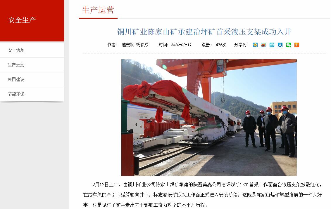 2月12日上午,由銅川礦業(yè)公司陳家山煤礦承建的陜西美鑫公司冶坪煤礦1301首采工作面首臺液壓支架披戴紅花,在絞車繩的牽引下緩緩駛向井下,標志著該礦綜采工作面正式進入安裝階段,這既是陳家山煤礦轉型發(fā)展的一件大好事,也是見證了礦井走出去干部職工奮力攻堅的不平凡歷程。